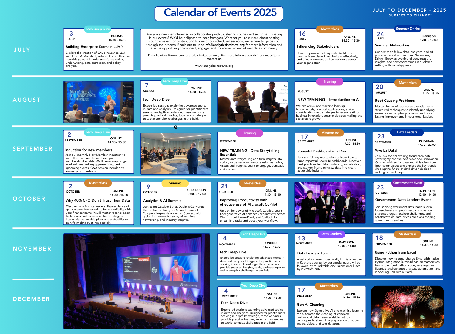 Events are at the heart of the Analytics Institute. Our events include our monthly ‘Inspire Events’ with case studies and best practices from member organisations, our monthly Masterclasses delivers by industry experts, our Data Leaders Forum events for our senior members and our hugely popular Analytics Summit and Analytics & AI Awards. We host over 50 events per year to ensure everyone has an opportunity to engage with the community. We also use online platforms to reach all members.